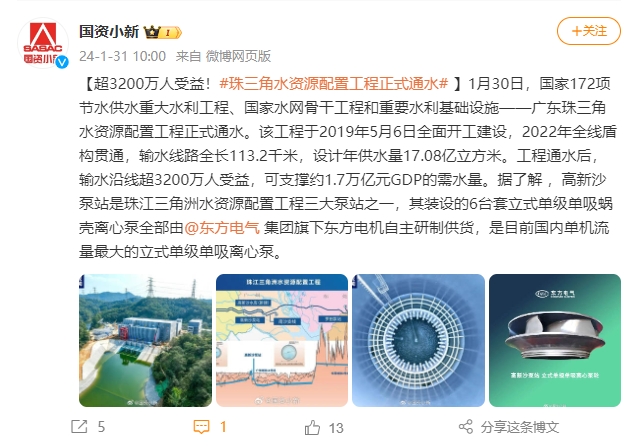 【超3200万人受益!#珠三角水资源配置工程正式通水#】1月30日,国家172项节水供水重大水利工程、国家水网骨干工程和重要水利基础设施——广东珠三角水资源配置工程正式通水。该工程于2019年5月6日全面开工建设,2022年全线盾构贯通,输水线路全长113.2千米,设计年供水量17.08亿立方米。工程通水后,输水沿线超3200万人受益,可支撑约1.7万亿元GDP的需水量。据了解 ,高新沙泵站是珠江三角洲水资源配置工程三大泵站之一,其装设的6台套立式单级单吸蜗壳离心泵全部由@优发国际集团旗下东方电机自主研制供货,是目前国内单机流量最大的立式单级单吸离心泵。